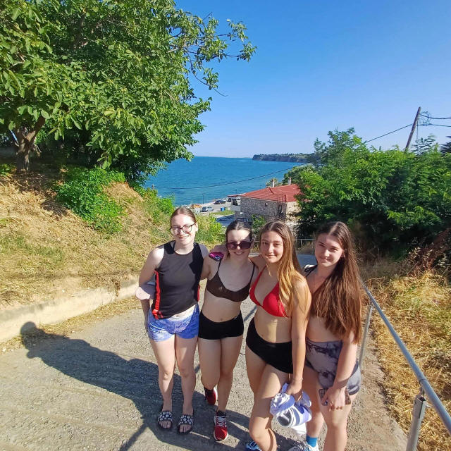 Edzésről hazafelé, Háttérben az Égei-tenger.