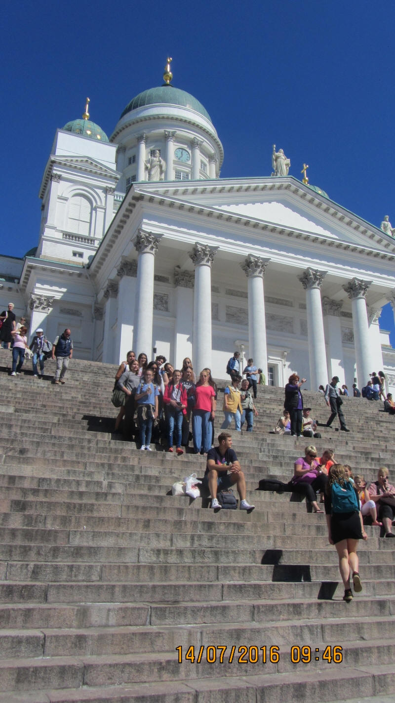 Csoportkép Helsinkiben a Székesegyház előtt.