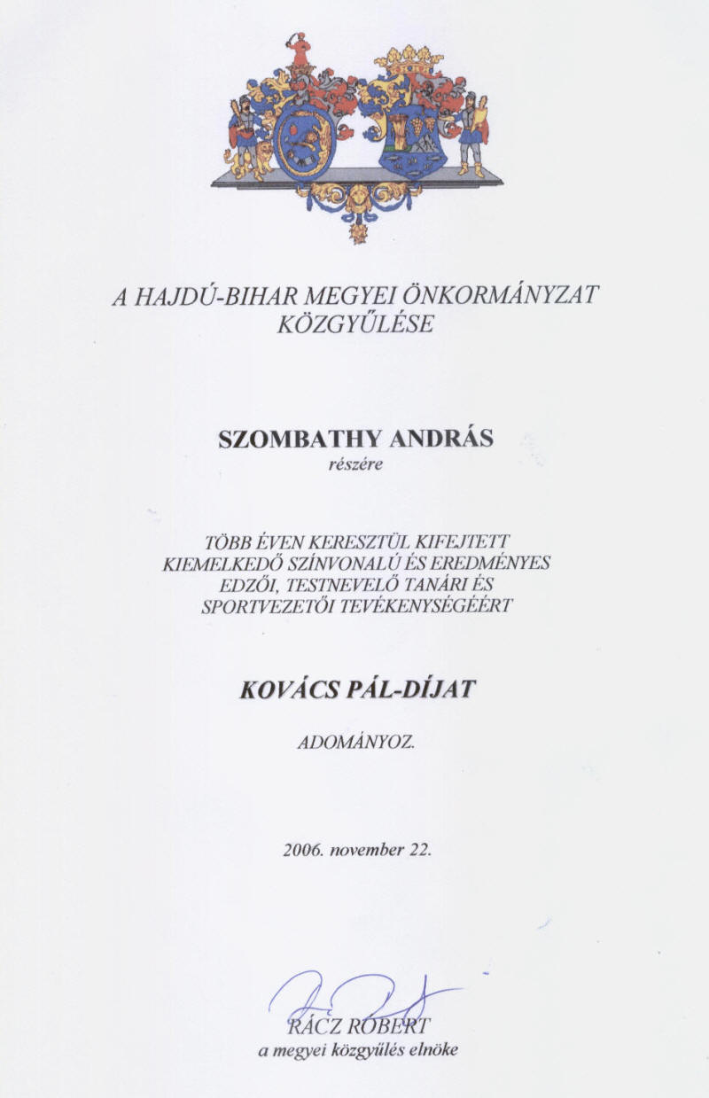 2006-ban Szombathy András szakágvezető Kovács Pál-díjat kapott a Hajdú-Bihar Megyei Önkormányzattól.